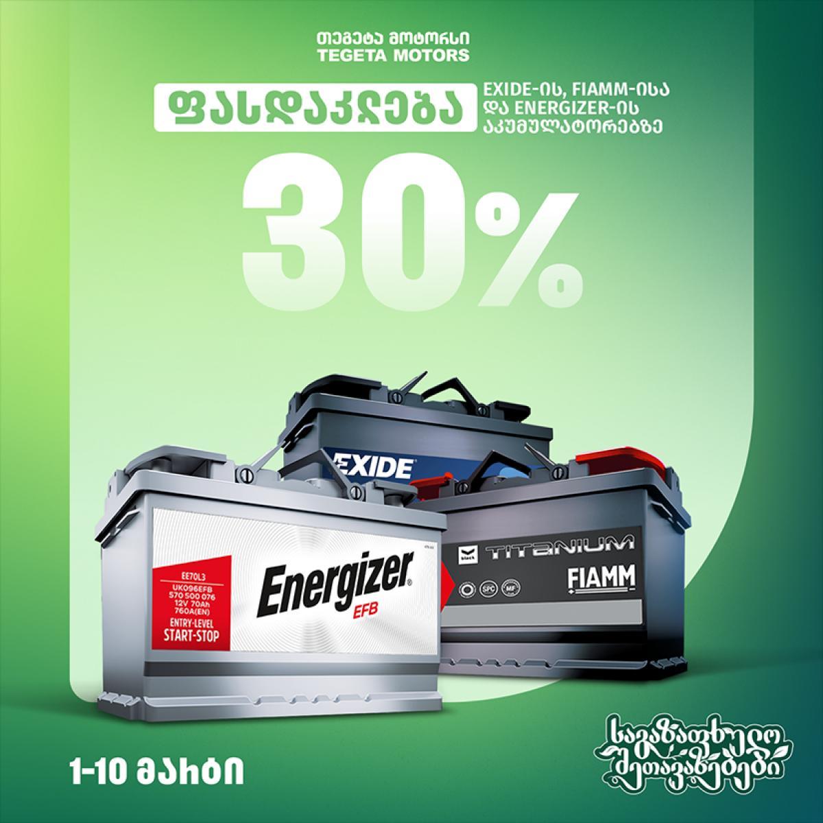 30%-იანი ფასდაკლება exide-ის, fiamm-ის, energizer-ის ბრენდების აკუმულატორების სრულ ასორტიმენტზე