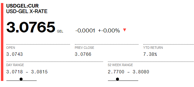 Bloomberg-ზე დღეს 1 დოლარის ვაჭრობა 3.0743-ად დაიწყო, ხოლო 13:20 სა...