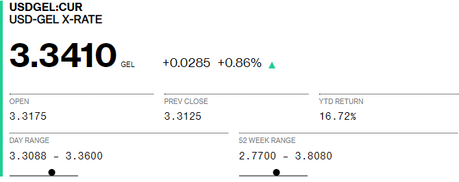 Bloomberg-ზე დღეს 1 დოლარის ვაჭრობა 3.3175-ად დაიწყო, ხოლო 12:30 სა...