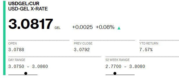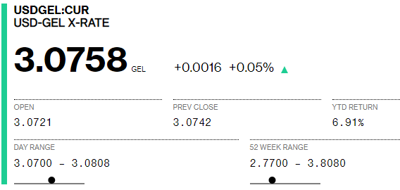 Bloomberg-ზე დღეს 1 დოლარის ვაჭრობა 3.0721-ად დაიწყო, ხოლო 13:00 სა...