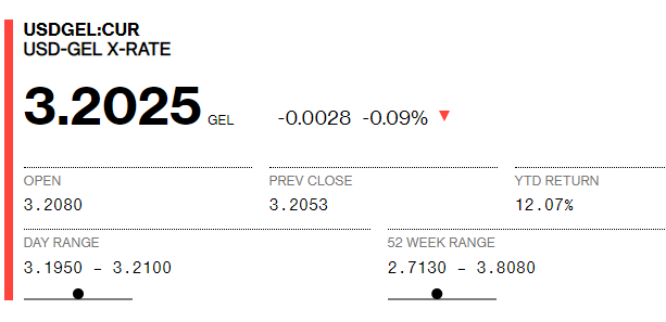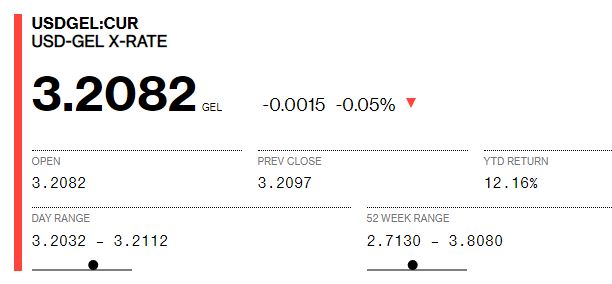 Bloomberg-ზე დღეს 1 დოლარის ვაჭრობა 3.2082-ად დაიწყო, ხოლო 12:45 სა...